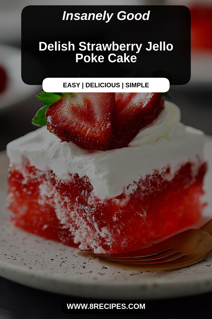 This Delish Strawberry Jello Poke Cake is basically nostalgia in pan form — a soft, pillowy cake full of suspiciously bright pink Jello, puddles of sweet strawberry juice, and a cloud of whipped topping that makes everyone act like they invented dessert. It’s special because it’s effortless showmanship: lots of texture, almost zero skill, and enough kitschy color to convince people you planned it for weeks. Try it when you want dessert that looks fancy but eats like your inner child is in charge.