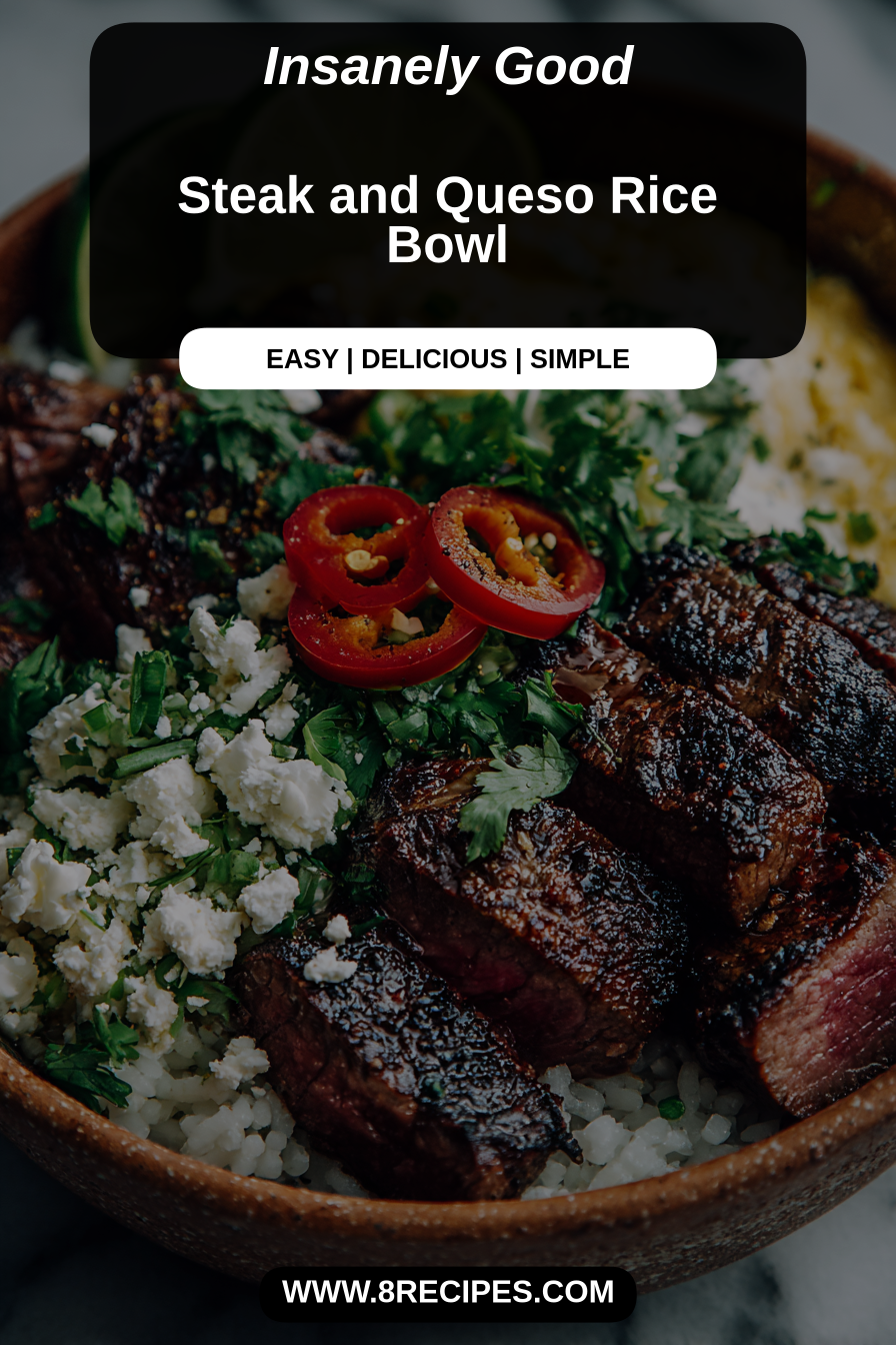 - Assemble the rice mixture in bowls, top with steak slices, and drizzle with melted queso cheese.